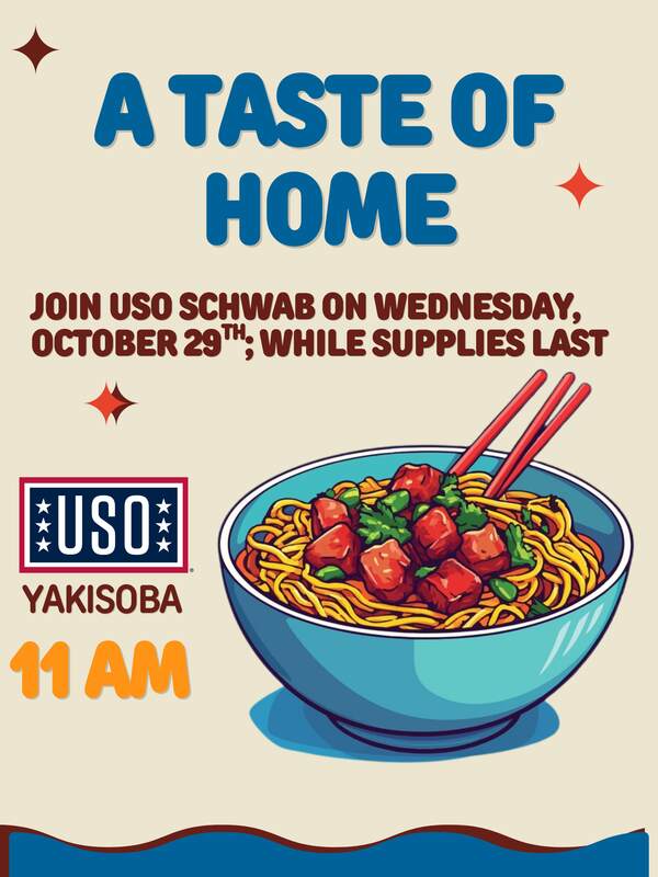 USO Schwab is bringing you A Taste of Home every Wednesday! Visit each Wednesday starting at 1100 for a delicious homecooked lunch, while supplies last.