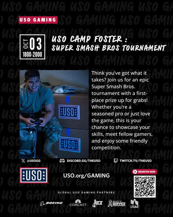 Join us at USO Camp Foster for a Super Smash Bros. Tournament! Compete, show off your skills, and battle for the top spot. Prizes await the champions—who will rise to the challenge?