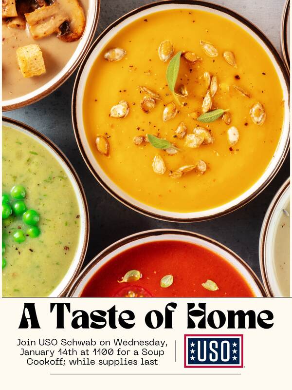 USO Schwab is bringing you A Taste of Home every Wednesday! Visit each Wednesday starting at 1100 for a delicious homecooked lunch, while supplies last.