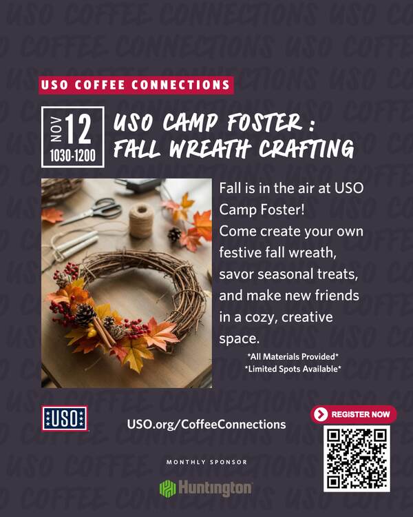 Let’s Join USO Camp Foster for a special Coffee Connections event! Enjoy a cozy morning filled with fall wreath crafting, delicious snacks, and opportunities to connect with fellow spouses.🍂✨
