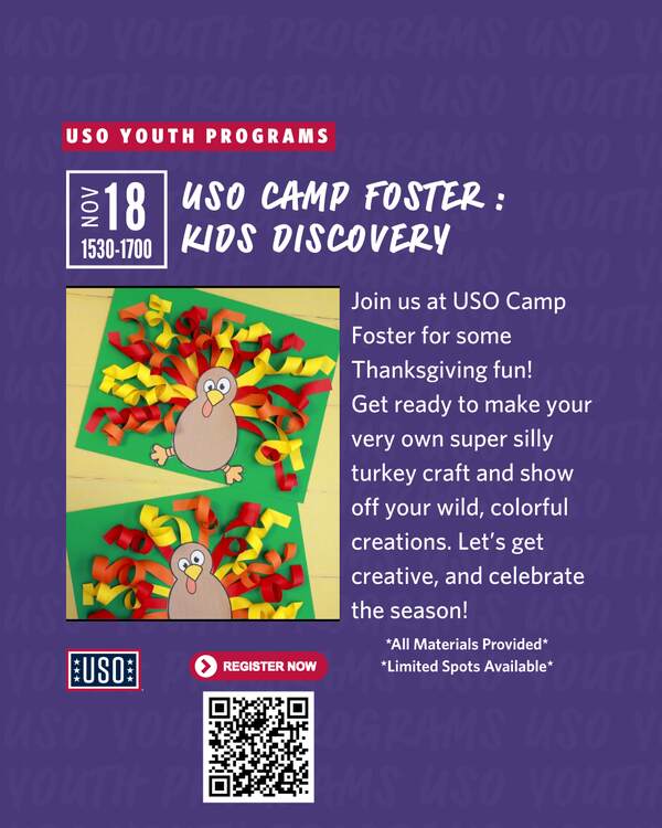 Join us at USO Camp Foster for a Kids Discovery adventure filled with festive fun and super silly turkey crafts! 🎨 Your little ones will love getting to be creative and show off their turkey masterpieces. 🧡🍁 🦃✨