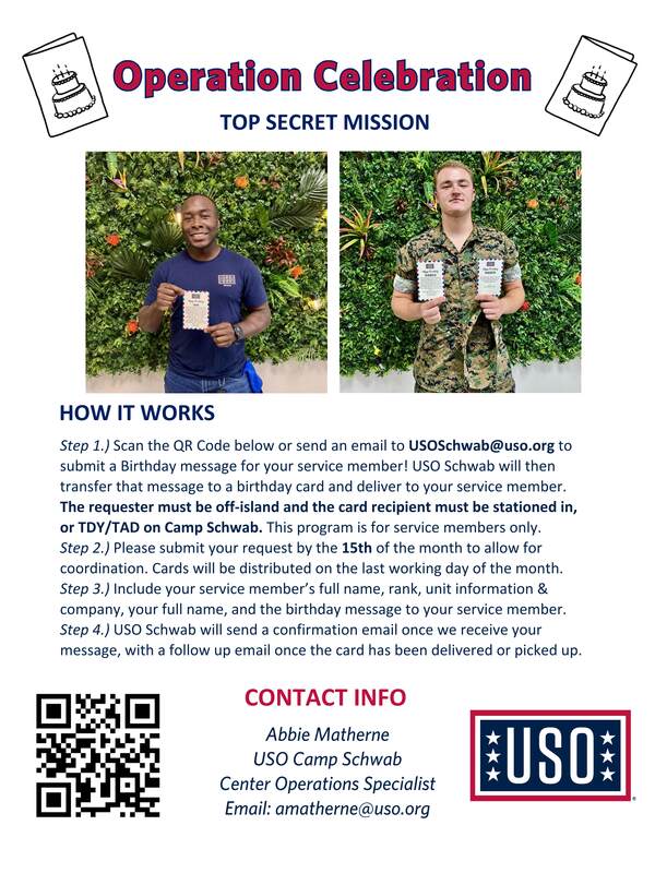 Send an email to USOSchwab@uso.org to submit a letter for your service member! The requester must be off-island and the card recipient must be stationed in, or TDY/TAD on Camp Schwab This program is for service members only. Please make your request at least two-weeks in advance to allow for coordination. Cards will be distributed on Friday, February 27th.