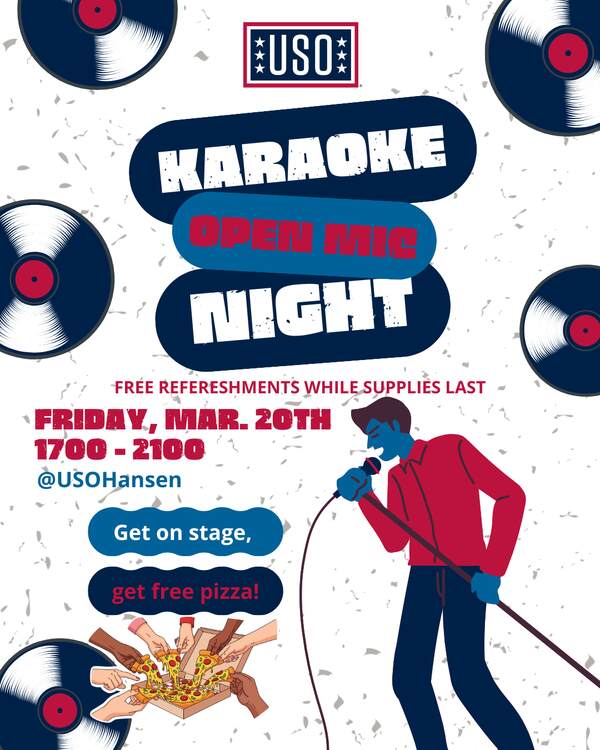 Testing, testing, one, two, three! Ah, there we go! Hey, you! Yes, you! We’ve got a date for Open Mic & Karaoke Night at USO Hansen! Karaoke, original songs, instruments, poetry, acting, comedy–anything goes! What do you say? Let’s turn up the volume and have a blast! Light refreshments will be provided.