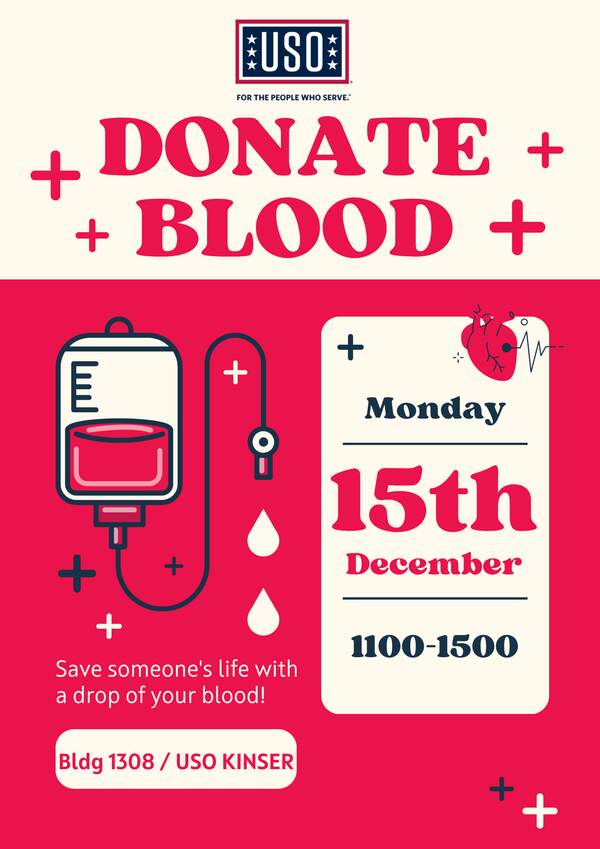 Make it your mission to save lives by donating blood. USO Kinser is teaming up with the Armed Services Blood Bank for a blood drive on Monday, December 15th 11:00 AM- 15:00 PM. Snacks, and refreshments will be provided.