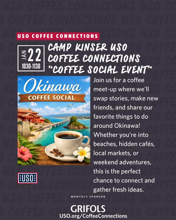 We will be providing coffee for 10 spouses (registration is required). During this event we will be sharing our favorite spots in Okinawa! USO Kinser will provide maps to pinpoint and save any favorites you may discover. Please bring the locations and even pictures of your favorite places, whether it be food related, beaches, amusement, parks, gardens, etc.