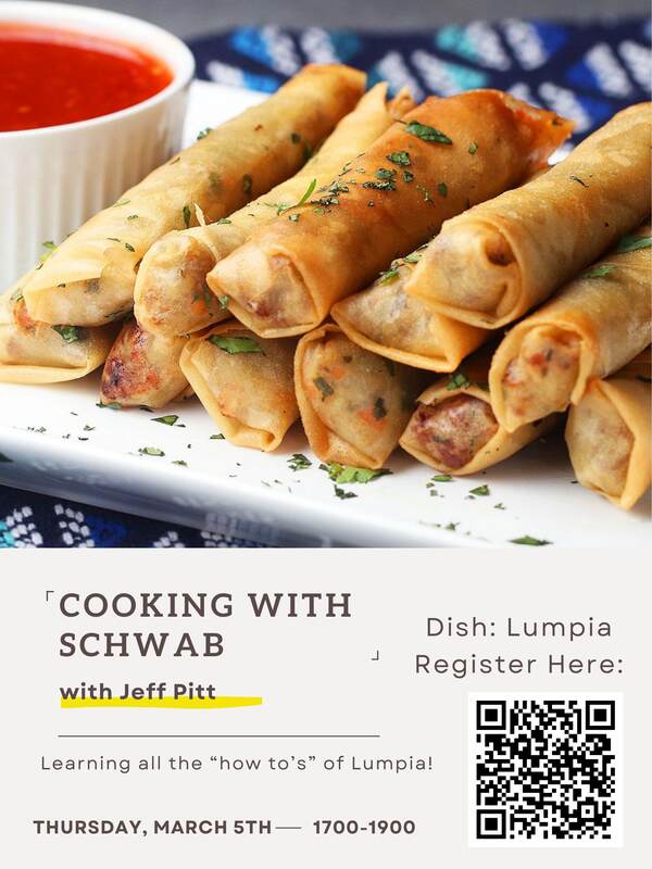Join us for an interactive Cooking with Schwab class as we dive into the art of making Lumpia. Learn the step-by-step process in this hands-on workshop that is perfect for both beginners and seasoned cooks. Participants will have the opportunity to explore cooking from scratch and enjoy their own creations. Come hungry and ready to roll. Registration is required.