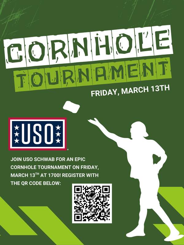 Join us on Friday, March 13th from 1700 to 1900 at USO Schwab for an exciting Cornhole Tournament! Whether you’re a seasoned pro or a first-timer, everyone is welcome to participate. Prizes will be awarded to the top team! Don’t miss out—grab a partner and get ready to toss! Registration is required!