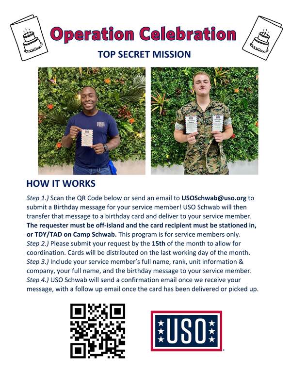 Send an email to USOSchwab@uso.org to submit a letter for your service member! The requester must be off-island and the card recipient must be stationed in, or TDY/TAD on Camp Schwab This program is for service members only. Please make your request at least two-weeks in advance to allow for coordination. Cards will be distributed on Tuesday, March 31st.