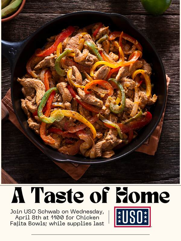 USO Schwab is bringing you A Taste of Home every Wednesday of every month! Visit each Wednesday starting at 1100 for a delicious homecooked lunch, while supplies last.