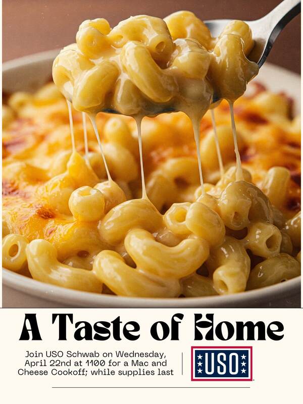 USO Schwab is bringing you A Taste of Home every Wednesday of every month! Visit each Wednesday starting at 1100 for a delicious homecooked lunch, while supplies last.