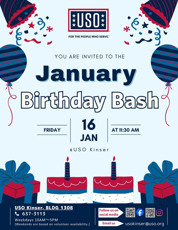 🎉🎂 January Birthday Bash! 🎂🎉 Calling all January birthdays! Join us as we celebrate everyone born in January at USO Kinser. We’ll have cake and good vibes as we celebrate you. Don’t miss out! Come grab a slice and celebrate with us!