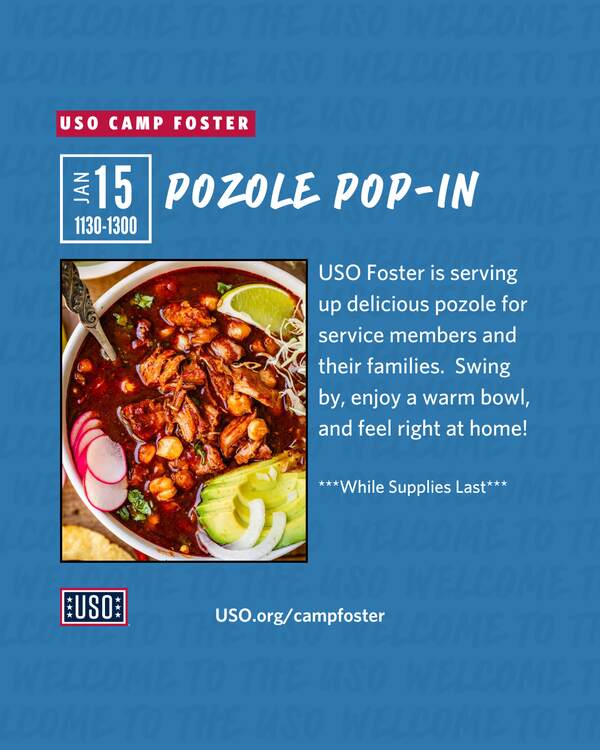 Pozole Pop-In happening at USO Camp Foster! Come enjoy a hearty bowl, friendly faces, and a moment to relax.🍲😋
