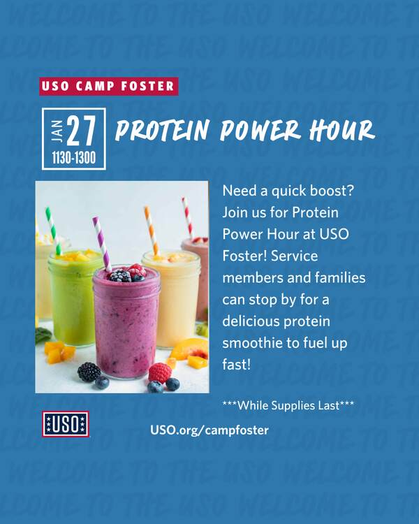 🍹💪USO Camp Foster’s Protein Power Hour is serving up quick sips and big fuel. Stop in, sip up, and power on! 💪🍹