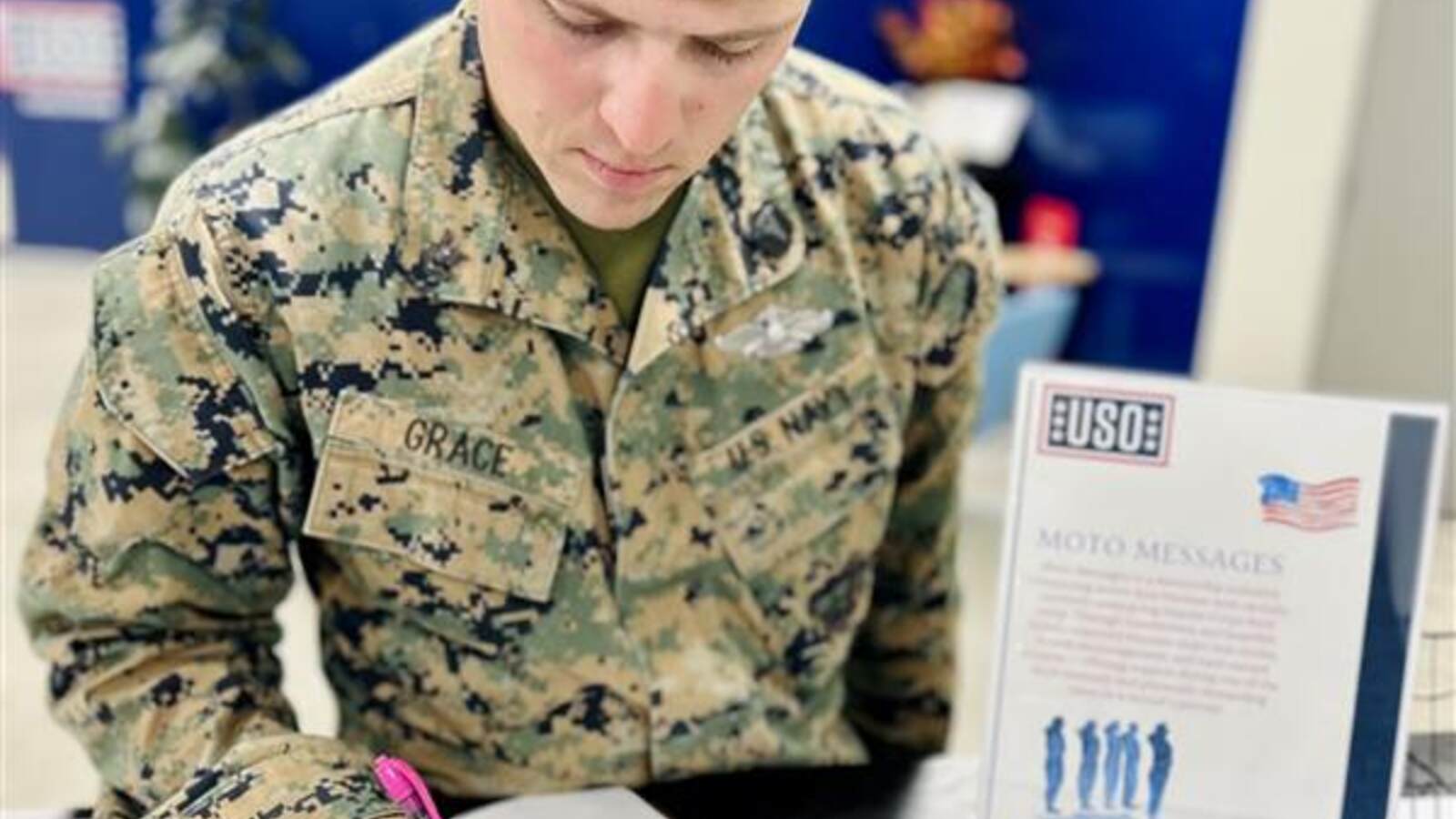 With a mission centered on strengthening the well-being of service members, the USO understands that connection matters from the very beginning. For many recruits, boot camp is also their first introduction to the USO. At Camp Schwab in Okinawa, Japan, that introduction often arrives in the form of a handwritten letter through the Moto Messages program. Written by active-duty Marines, these messages offer encouragement, understanding, and reassurance during a time when recruits can feel isolated and overwhelmed. Moto Messages reflects the USO’s commitment to being present from the first step of a Marine’s journey and continuing that support throughout their career.
